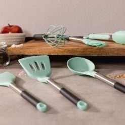 Set de 9 utensilios, con cabezal de color azul, recubierto por soft touch y mango de acero. Los materiales principales consisten en silicona, nylon y PP. Como accesorio, este set incluye un holder de Polka.