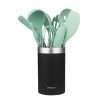 Set de 9 utensilios, con cabezal de color amarillo pastel, recubierto por soft touch y mango de acero. Los materiales principales consisten en silicona, nylon y PP. Como accesorio, este set incluye un holder de Polka.