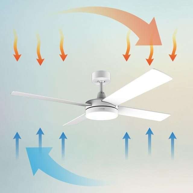 El ventilador dispone de un sistema de inversión de giro del motor para realizar la función Verano/Invierno. Mediante un conmutador se selecciona el sentido de rotación de las aspas, en un sentido en Verano para generar una agradable brisa y en sentido contrario en Invierno para impulsar el aire caliente concentrado en el techo hacia el suelo, perfecto para complementar tu sistema de calefacción.